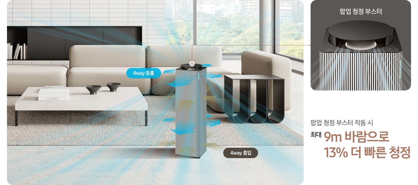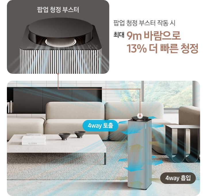 팝업 청정 부스터를 작동시키면 넓은 공간의 공기도 더 빠르게 청정할 수 있죠.