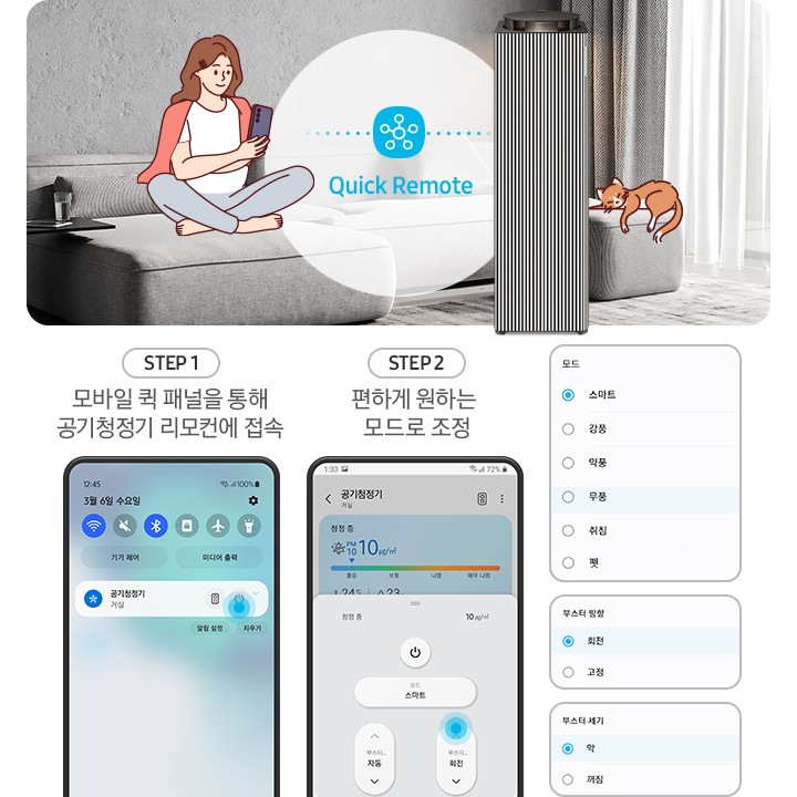 * Quick Remote 기능을 사용하기 위해서는 SmartThings 앱(SmartThings 버전 1.8.13.** 이상) 설치 및 공기청정기의 기기 연결이 필요합니다.