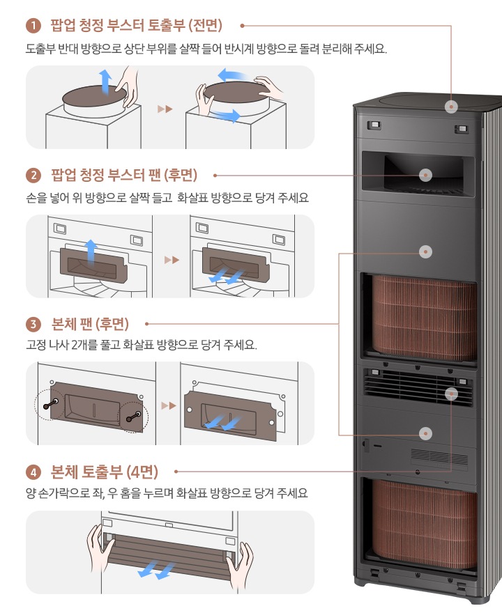 공기를 흡입 및 토출하여 청정하는 방식입니다.