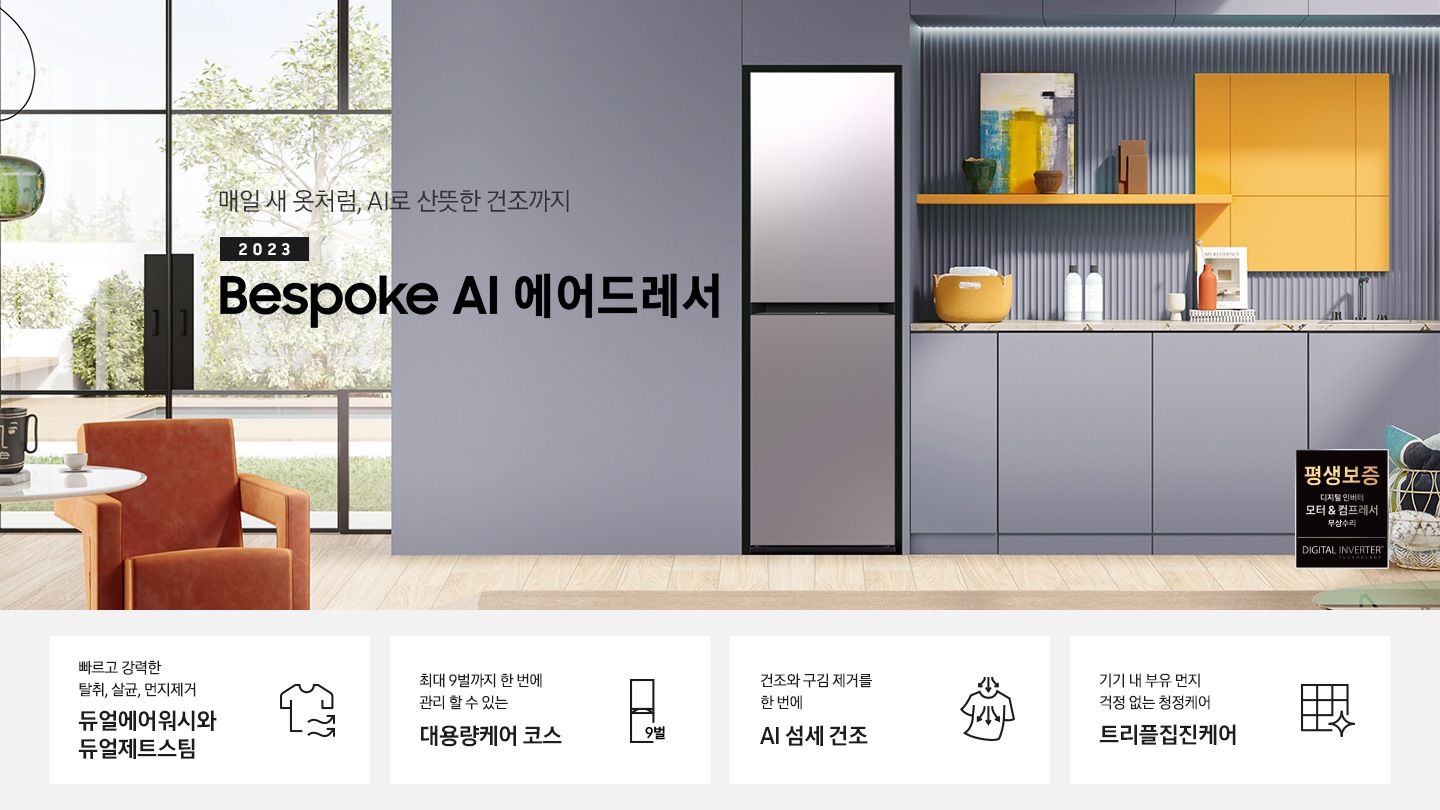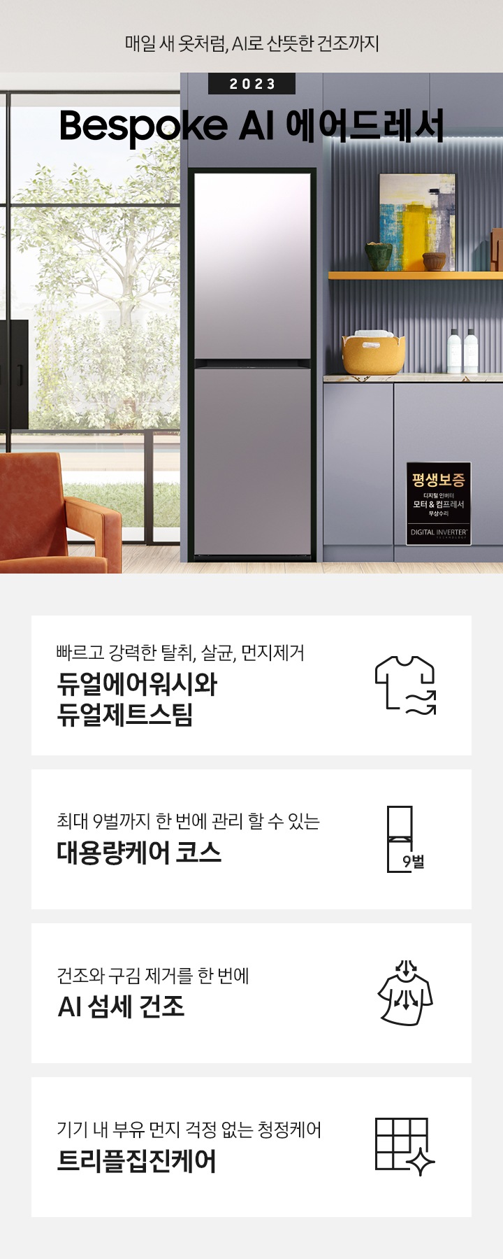 * 듀얼에어워시의 '듀얼' 의미는, 옷걸이와 제품 내부 최상단 두 곳에서 에어워시가 옷 안팎으로 토출된다는 의미임.