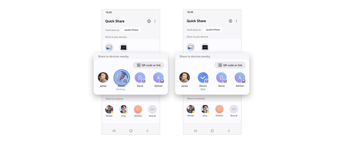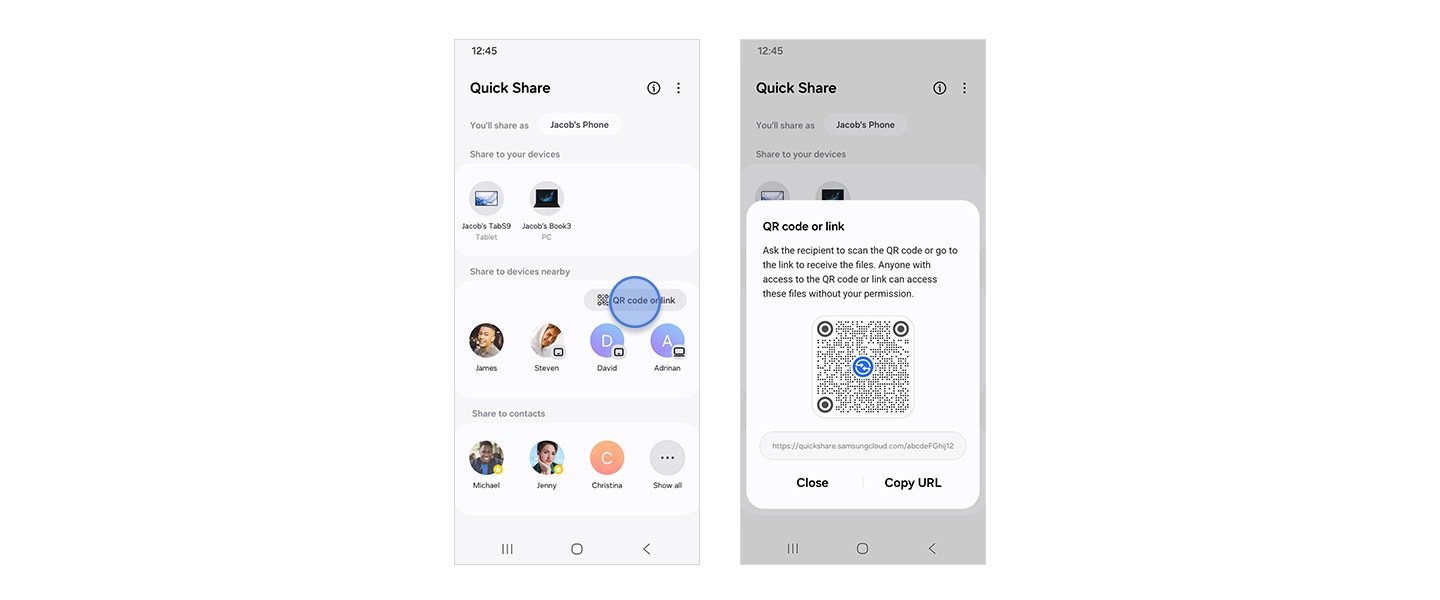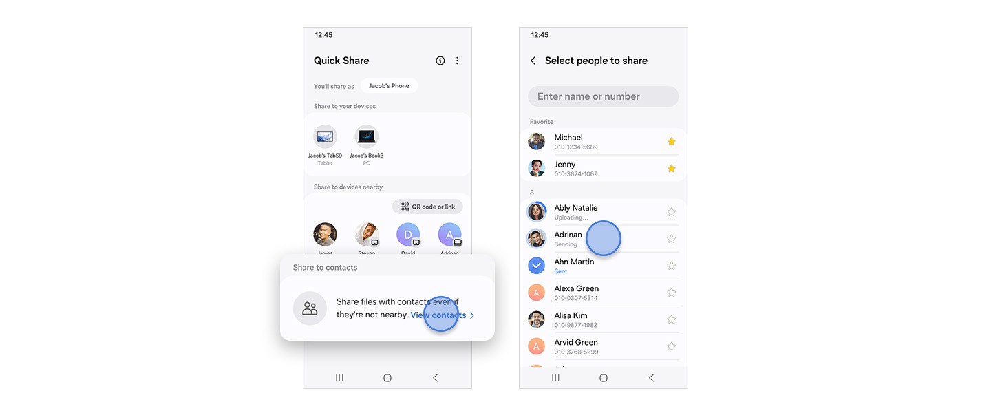 파일을 공유할 친구가 근처에 없더라도 연락처만 있으면 Quick Share를 사용하여 받는 사람의 기기에 파일을 공유할 수 있습니다.
