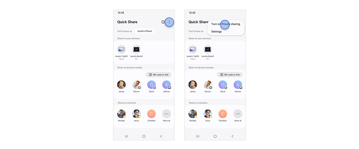 Quick Share의 ‘프라이빗 공유’란 무엇인가요?프라이빗 공유를 사용하려면 Quick Share 화면 상단의 '추가 옵션' 메뉴를 누르고 '프라이빗 공유 켜기'를 선택하세요.