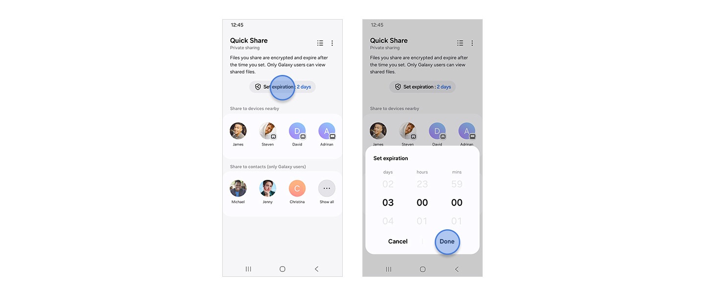 * 10분 동안만 사용 가능 : 근처에 있는 모든 사람과 10분 동안 공유 후 '저장된 연락처만' 또는 '받지 않음(삼성 계정에 로그인하지 않은 경우)'으로 자동 전환됩니다.