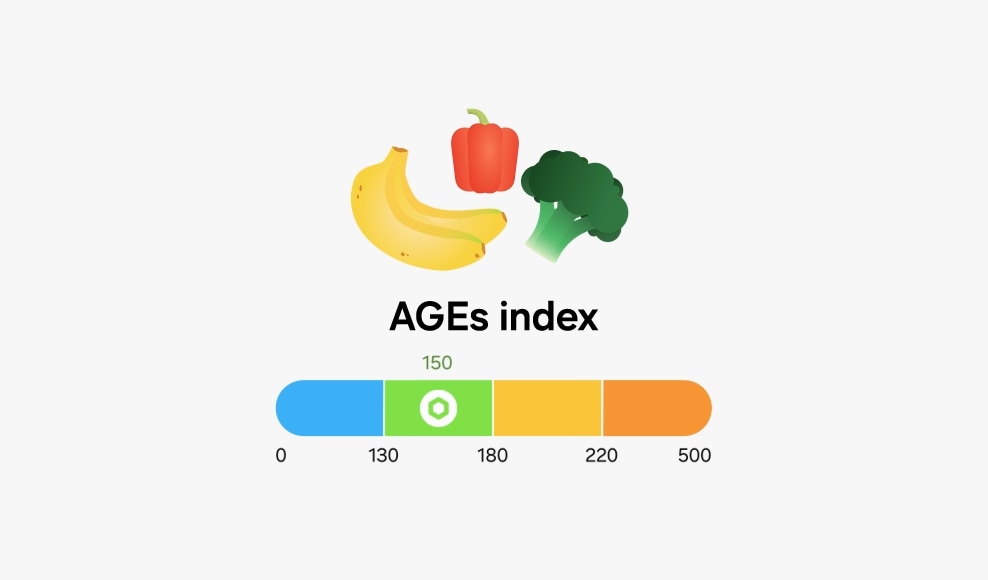 최종당화산물 AGEs 지수란 무엇인가요?최종당화산물 AGEs(Advanced Glycation End-products) 지수는 생물학적 나이를 나타내는 지표로 식습관과 생활 습관에 따라 큰 영향을 받습니다.