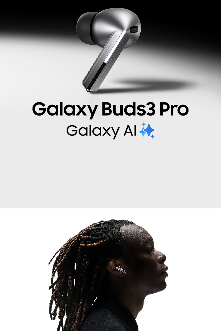 실버 컬러의 버즈3 프로 이어버드 하나가 검정색과 흰색의 배경 위, 좌측에 놓여있습니다. 아래에는 Galaxy Buds3 Pro, Galaxy Ai 텍스트가 있습니다. 우측 이미지에는 실버 컬러 버즈3 프로를 낀 남성의 옆모습이 있습니다. 실버 컬러의 버즈3 프로 이어버드 하나가 검정색과 흰색의 배경 위, 좌측에 놓여있습니다. 아래에는 Galaxy Buds3 Pro, Galaxy Ai 텍스트가 있습니다. 우측 이미지에는 실버 컬러 버즈3 프로를 낀 남성의 옆모습이 있습니다.