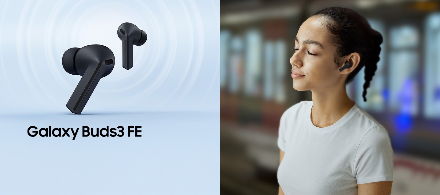 좌측에 블랙 컬러의 버즈3 FE 이어버드 한쌍이 앞뒤로 떠있습니다. 우측 이미지에는 블랙 컬러 버즈3 FE를 낀 여성의 모습이 있습니다. 좌측에 블랙 컬러의 버즈3 FE 이어버드 한쌍이 앞뒤로 떠있습니다. 우측 이미지에는 블랙 컬러 버즈3 FE를 낀 여성의 모습이 있습니다.