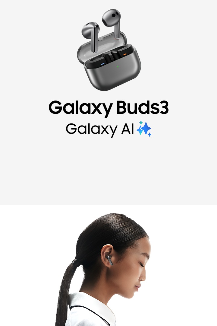 좌측에 실버 컬러의 버즈3의 케이스 위로 이어버드 한쌍이 함께 떠있습니다. 알래에는 Galaxy Buds3, Galaxy Ai 텍스트가 있습니다. 우측 이미지에는 실버 컬러 버즈3를 낀 여성의 옆모습이 있습니다. 좌측에 실버 컬러의 버즈3의 케이스 위로 이어버드 한쌍이 함께 떠있습니다. 알래에는 Galaxy Buds3, Galaxy Ai 텍스트가 있습니다. 우측 이미지에는 실버 컬러 버즈3를 낀 여성의 옆모습이 있습니다.