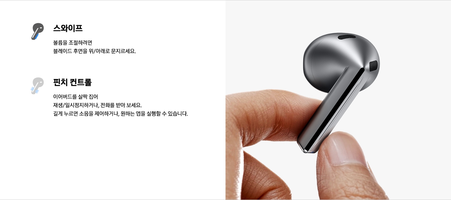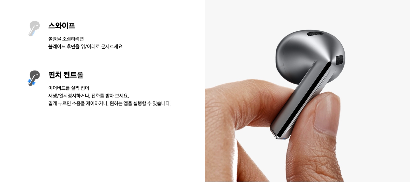 스와이프로 볼륨을 조절하고, 이어버드를 살짝 집거나
