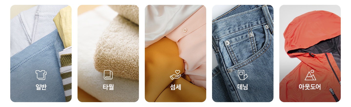 * 일반(면), 타월, 섬세, 데님, 아웃도어 등 5종의 옷감을 감지하며, 성질이 다른 옷감을 함께 세탁하거나 기타 옷감을 세탁하는 경우 가장 유사한 옷감으로 감지합니다.