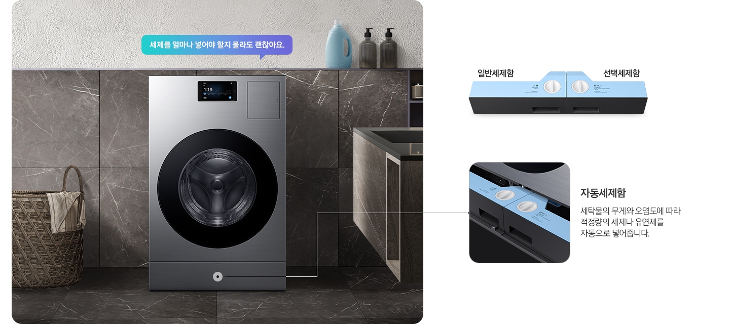 세탁물의 무게를 감지해 적정량의 세제와 유연제를 자동으로 넣어줍니다.