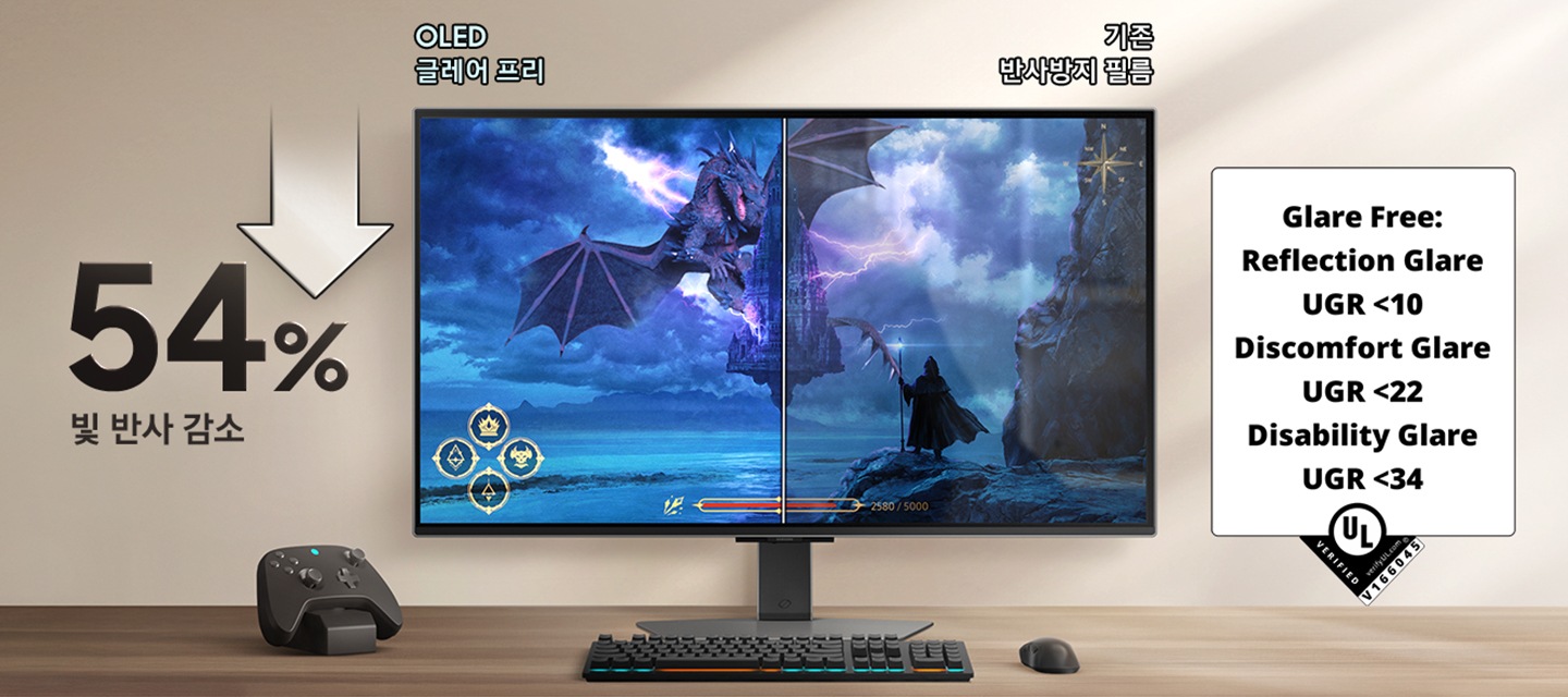 삼성의 글레어 프리는 기존 반사 방지 필름보다 빛 반사가 54% 낮아 외부 광원의 반사를 차단합니다.