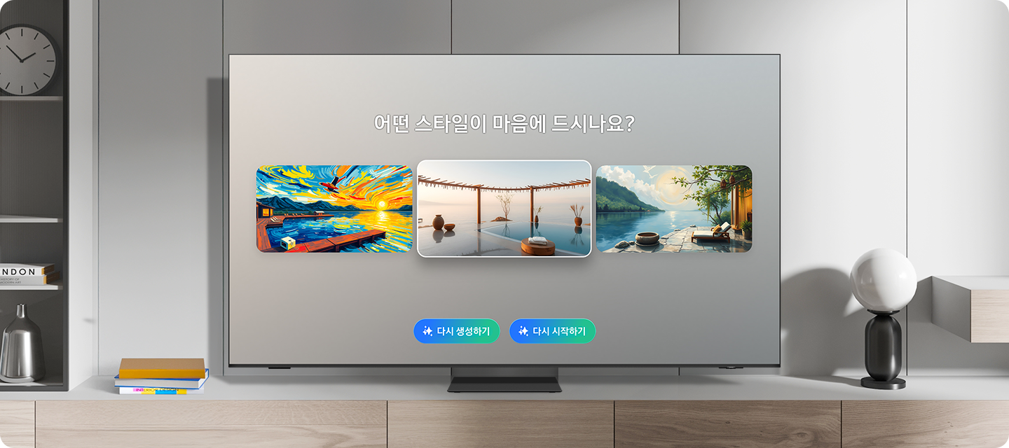 - 생성형 배경화면: 1일 생성 가능한 횟수는 제한될 수 있습니다. TV 화면에 표시되는 이미지는 AI로 생성됩니다. 해당 기능은 OLED 모델에서는 지원되지 않으며, 중국에서 지원되지 않습니다.