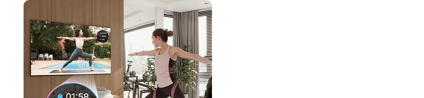 - 운동 트래커: 갤럭시 Watch4 이상 모델과 최신 소프트웨어 버전이 설치된 갤럭시 모바일(One UI 4.1.1 이상)에서 지원됩니다. 기기는 동일한 삼성 계정에 로그인되어 있어야 합니다. 운동 트래커를 사용하려면 시계와 모바일 기기를 TV 화면 가까이 두세요.