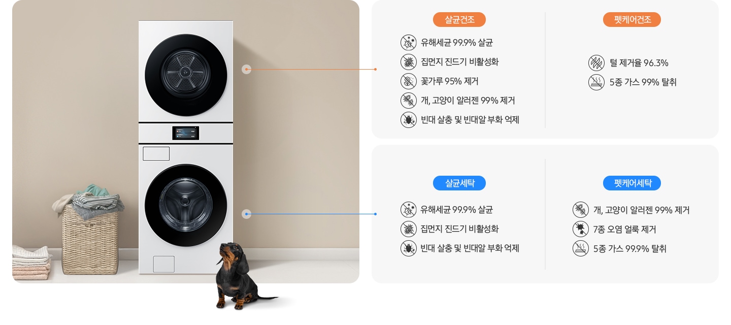 - 펫케어건조 코스 털 제거율 96.3%, 마른 세탁물 1.5kg 부하 기준