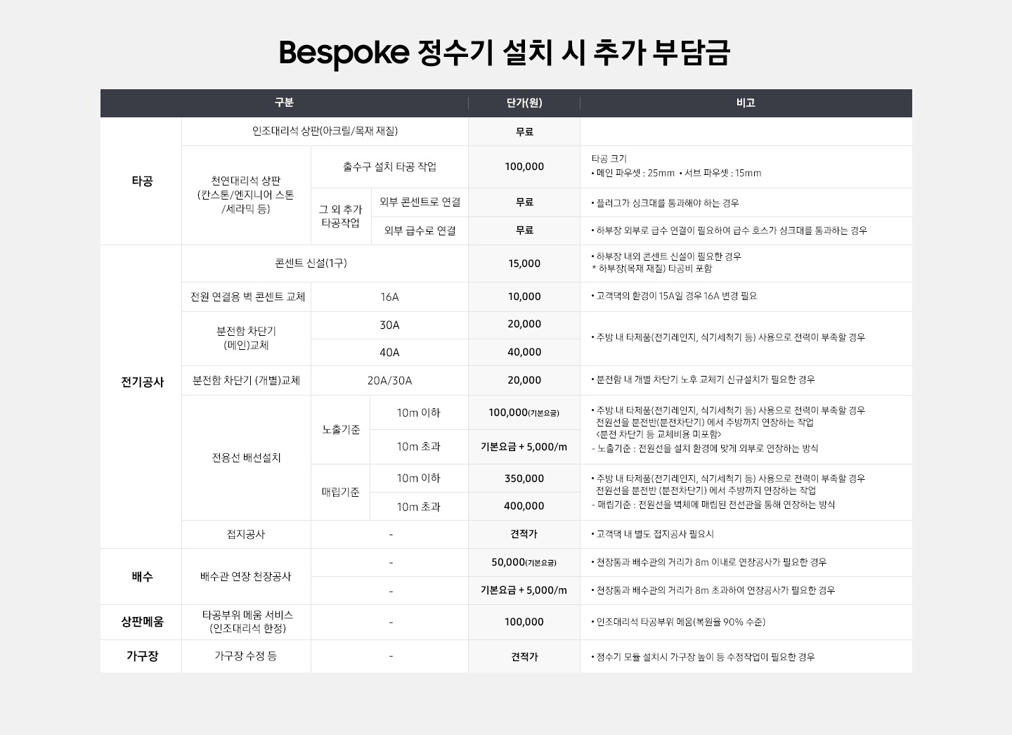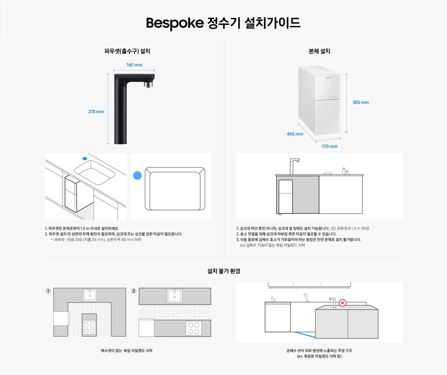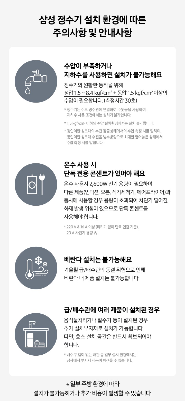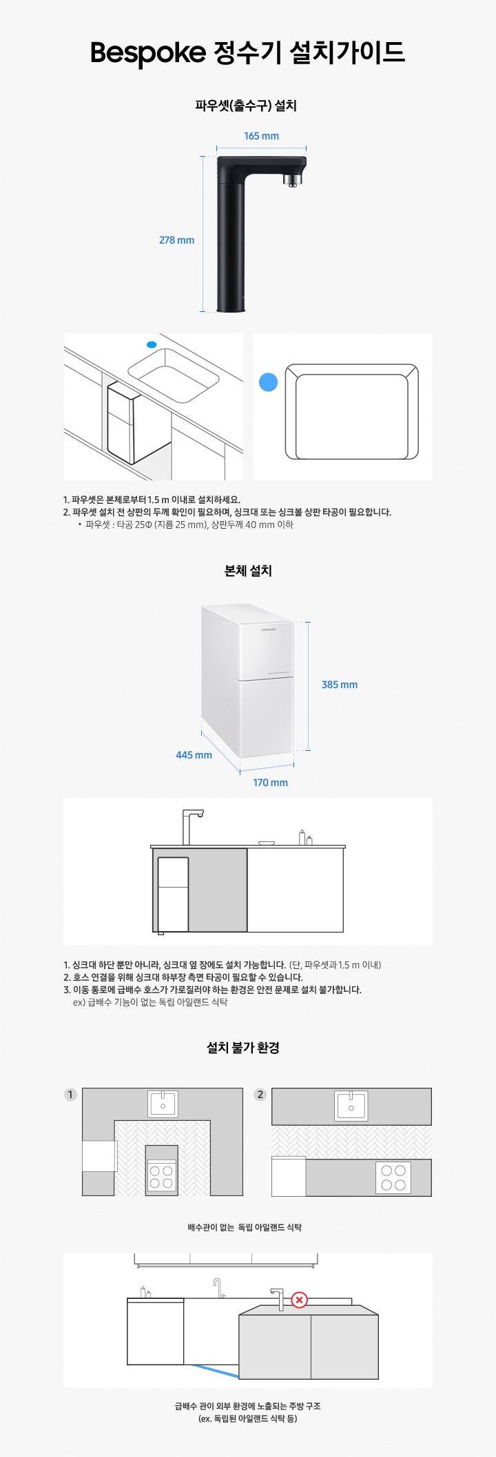 * 위 이미지는 연출된 이미지로 실제와 다를 수 있으며, 배수관이 없는 독립 아일랜드 식탁에는 정수기 설치가 불가합니다.
